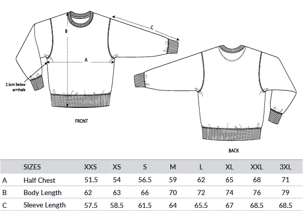 Set-in sleeve. Inside herringbone back neck tape. Self fabric half moon at back neck. Single needle topstitch at neckline. 2x2 rib at sleeve hem and bottom hem. Armhole, sleeve hem and bottom hem with twin needle topstitch. Relaxed fit with 350gsm brushed fabric. Vegan certified. Fair Wear certified. GOTS certified. Oeko-Tex certified.